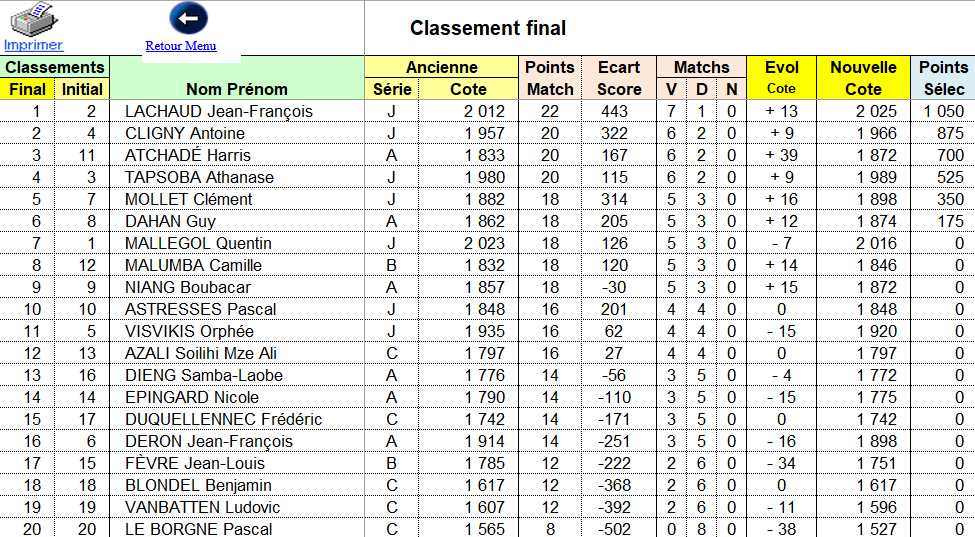 En série A, Harris (3e), en série B, Camille (8e) et en série C, Soilihi (12e) se seront illustrés. Harris obtient aussi la meilleure progression avec +39 ELO, devant Clément +16 et Boubacar +15.