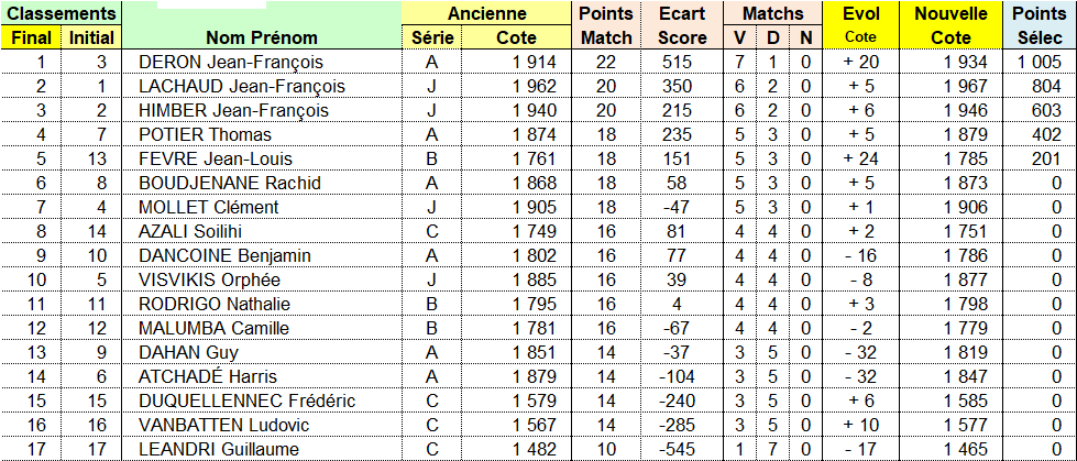 Victoire de Guy Biron (Open) devant David Bouaziz (Neuilly-Plaisance) et Benjamin Ballarotta (Aillant sur Thonon comité C)