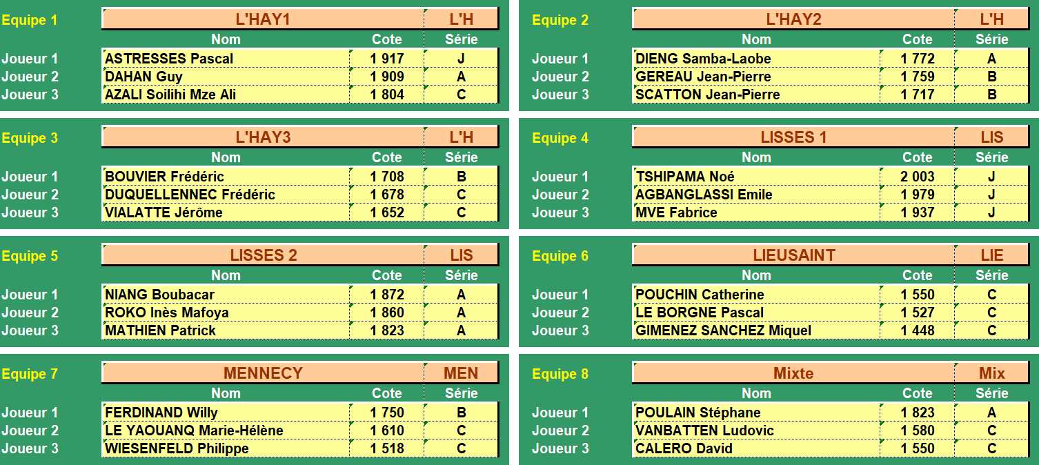 ► 8 équipes inscrites (24 joueurs) : 3 V07, 2 V33, 1 V39, 1 V09, 1 équipe mixte (V07/V05)